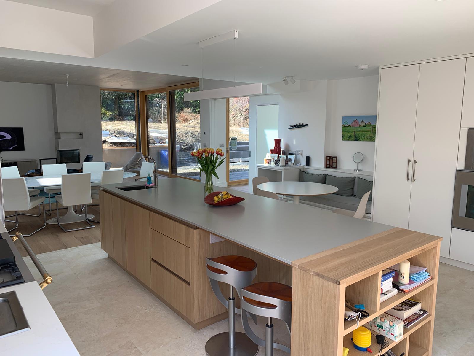 The choice was to use two selections of different tones for the bathroom and the kitchen: Kitchen: PDR030 Milk Shake in the Modern Finish (Stuccoed and Polished) Bathroom: PDR067 Light Blend, always in the modern finish. Damien and Eugene, to further differentiate the environments, opted to also use two different formats: